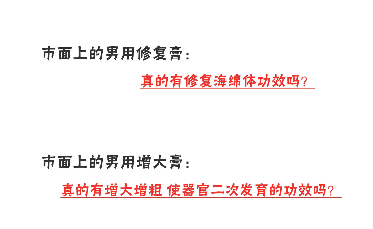 一种是男用修复膏,一种是男用增大、增粗膏,那下面我试着用这两种类型产品的宣传和作用逻辑、来解构这两种产品: